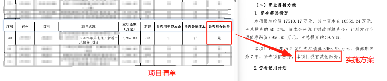 新增土储项目:在发行项目清单中,显示该项目为组合融资项目,除专项债融资外,涉及其他资金,而在实施方案中描述,该项目除专项债券资金外,没有其他融资,两者披露信息不一致。