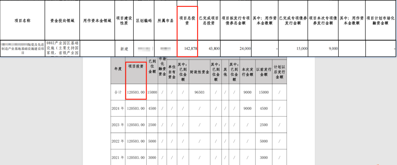 该项目在2024年1月、3月、5月、8月发行5个批次,其中在8月份发行的批次中,根据项目清单,该项目总投资14.2878亿元,但该批次项目实施方案中披露,该项目总投资12.0503亿元。
