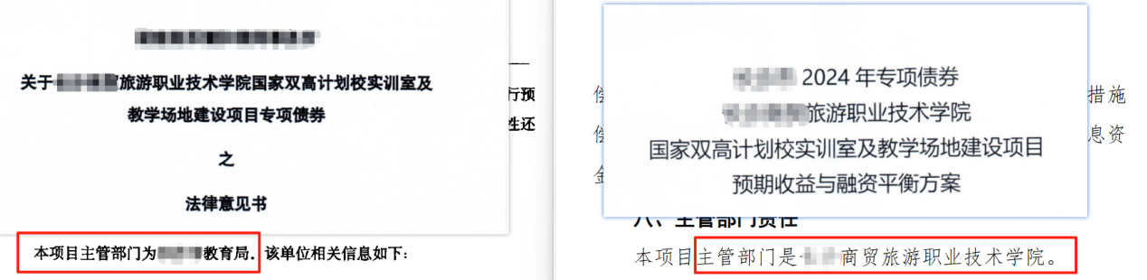 该项目在2024年8月份发行批次中,该项目方案中提到该项目主管部门为职业技术学院,而同批次法律意见书中将该地教育局作为主管部门。同一个项目出现两个主管单位。