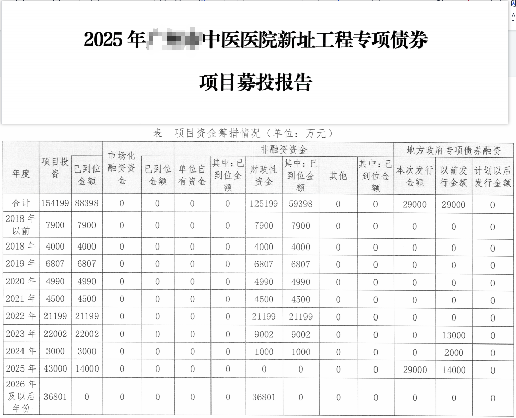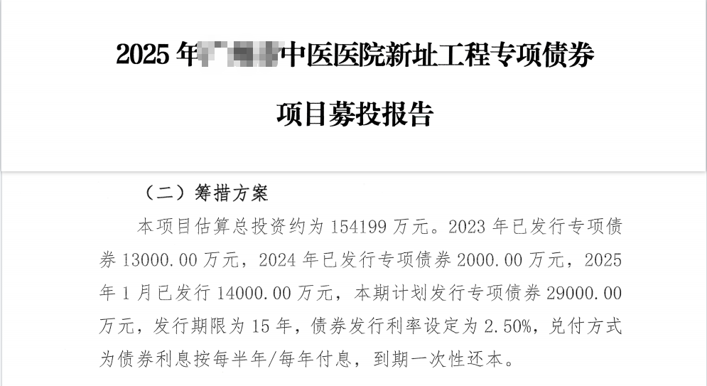 根据该项目最新批次披露的实施方案显示,该项目总投资15.4199亿元,分别在2023年、2024年、2025年分别发行地方政府债券1.3亿元、0.2亿元、4.3亿元。三年合计发行5.8亿元,且未采取市场化融资。