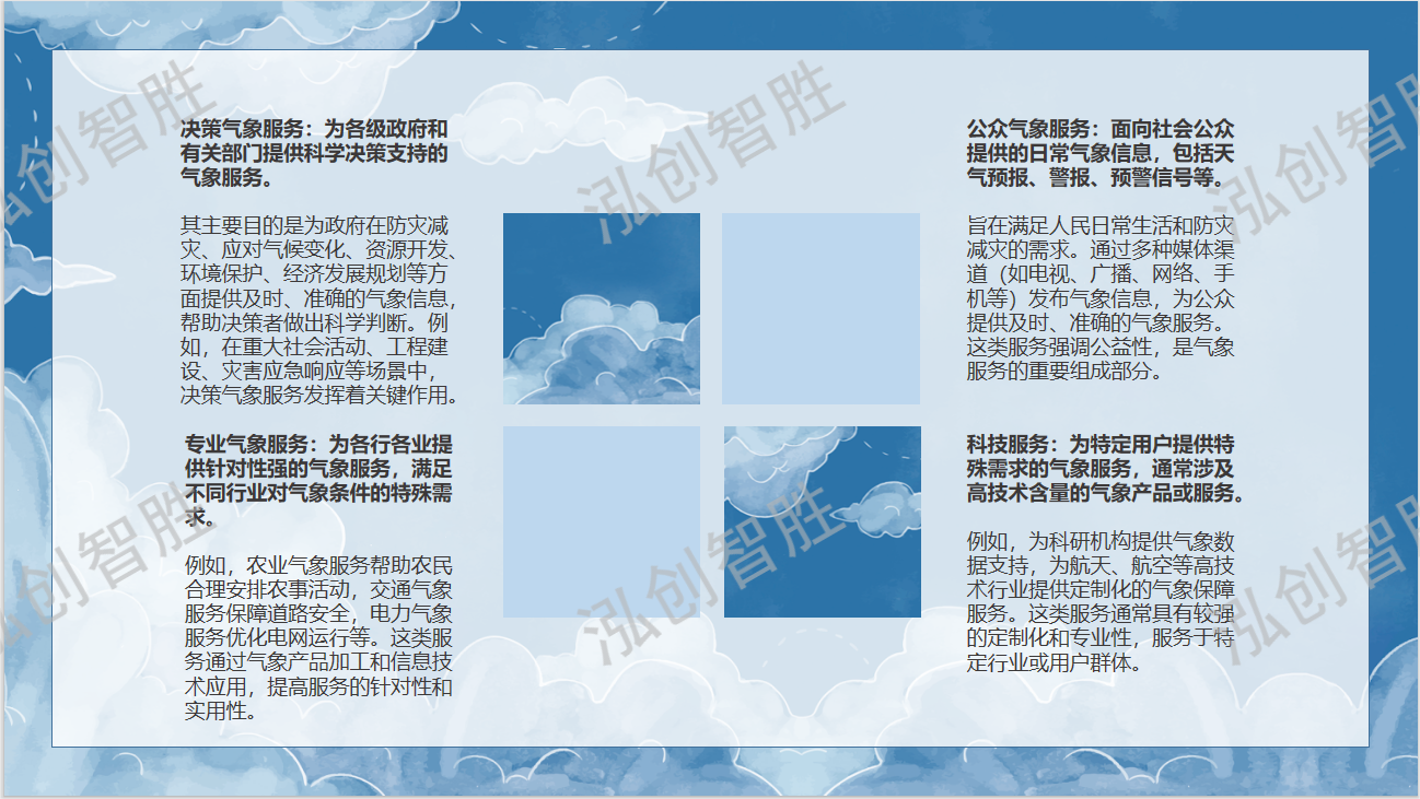 气象服务是以气象为主要对象的服务,可划分为决策气象服务、公众气象服务、专业气象服务和科技服务。这四者构成了覆盖全社会全方位的气象服务网。