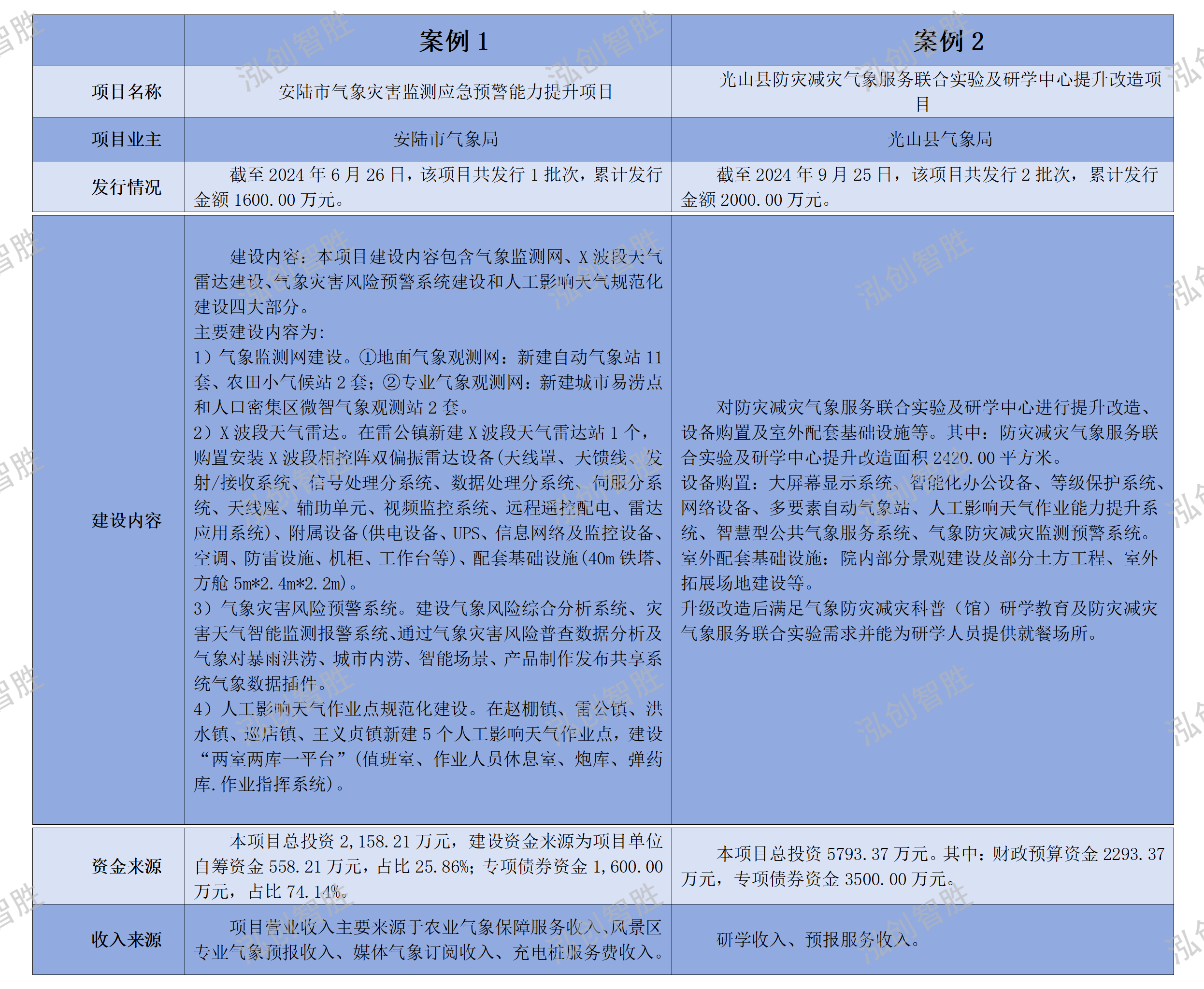 (四)审核重点:项目是否符合气象领域投向,是否存在负面清单内容;手续是否合规且齐全;收益测算是否合理且达标,是否剥离非气象相关收入;实施方案是否明确资产权属、还款来源及风险分担机制。