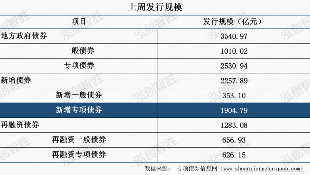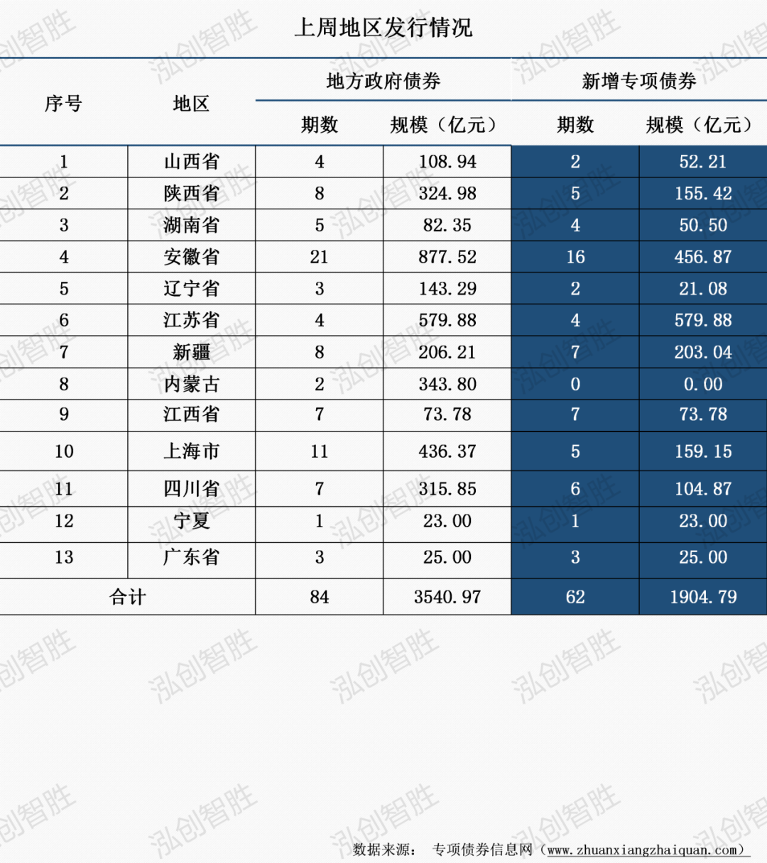 上周共有山西、陕西等13个地区发行84期地方政府债券,发行规模3541亿元;其中,涉及62期新增专项债券,发行规模1905亿元。