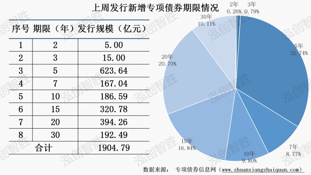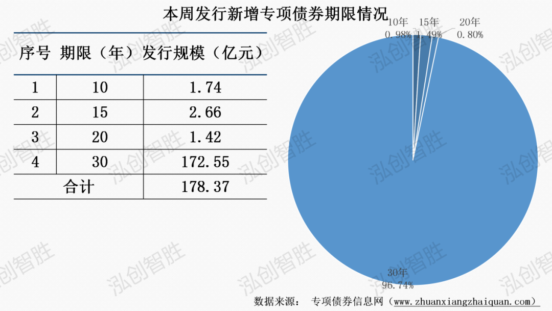上周发行新增专项债券涉及8种期限类型,2年期、3年期、5年期、7年期、10年期、15年期、20年期、30年期。