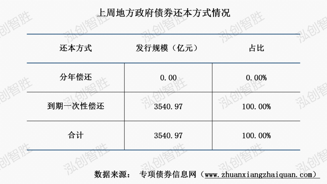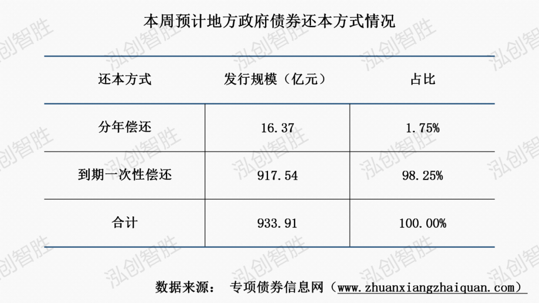 本周共发行19期地方政府债券,发行规模合计934亿元;其中,4期新增债券采取分年还本,其余债券均采取到期一次性还本。