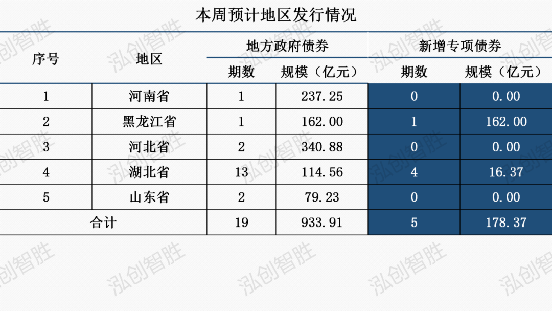 本周共有河南、河北等5个地区发行19期地方政府债券,发行规模934亿元;其中,涉及5期新增专项债券,发行规模178亿元。