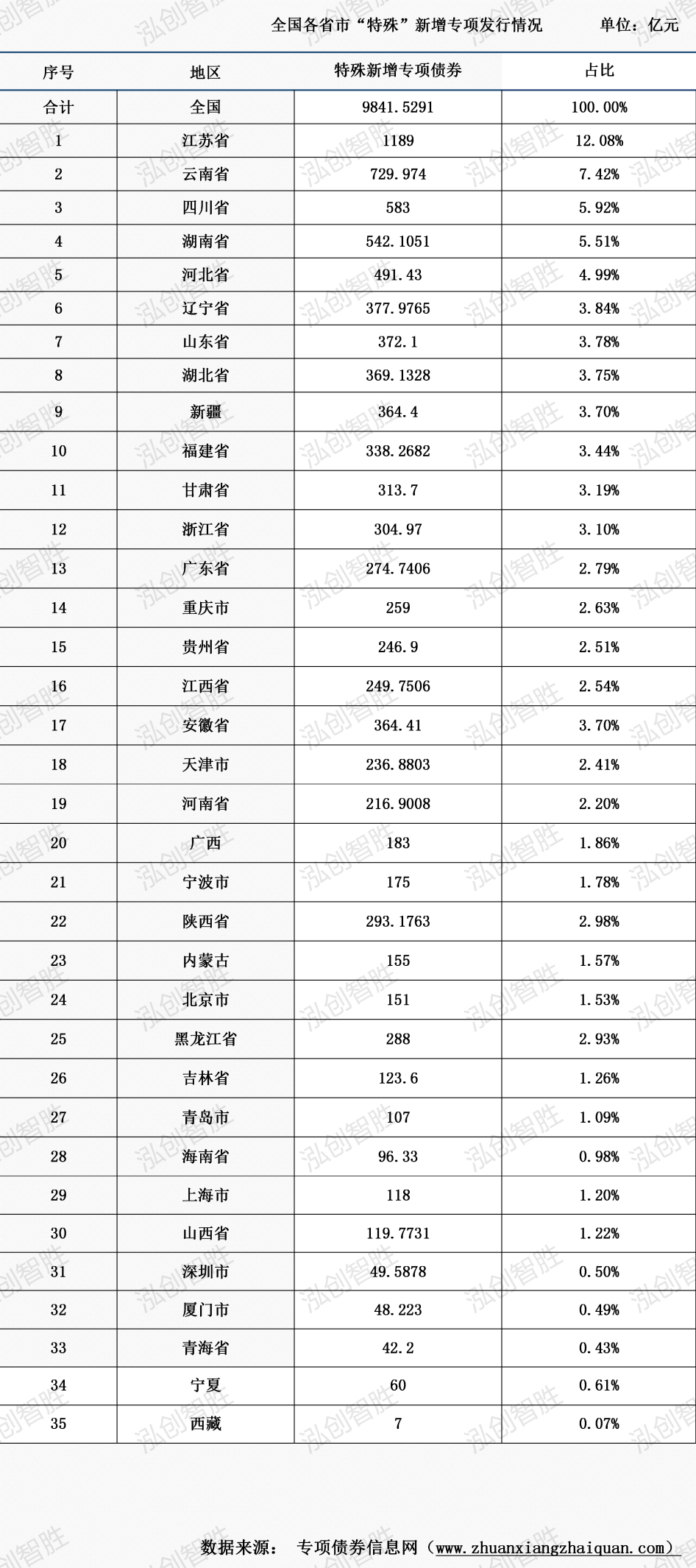 截至8月31日,已有浙江、河南等35个地区发行“特殊”新增专项债券,发行规模9841.5291亿元;