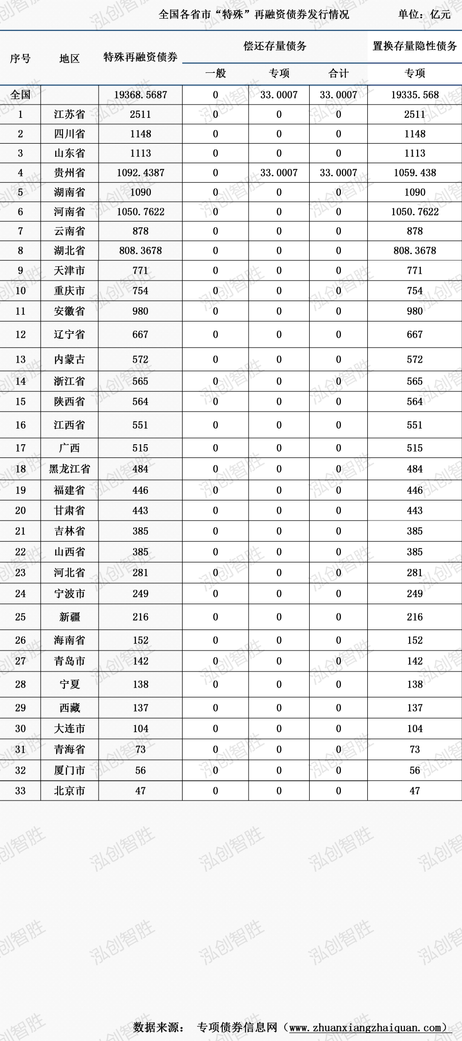 已有33个地区发行“特殊”再融资债券,发行规模19368.5687亿元;均用于“置换存量隐性债务”和“偿还存量债务”,已完成全年置换债券额度的96.84%。