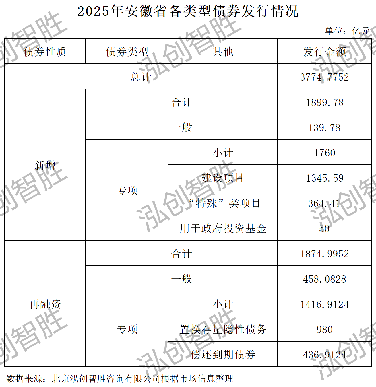 截至2025年9月16日,安徽省累计发行地方政府债券3774.78亿元,具体发行结构如下: