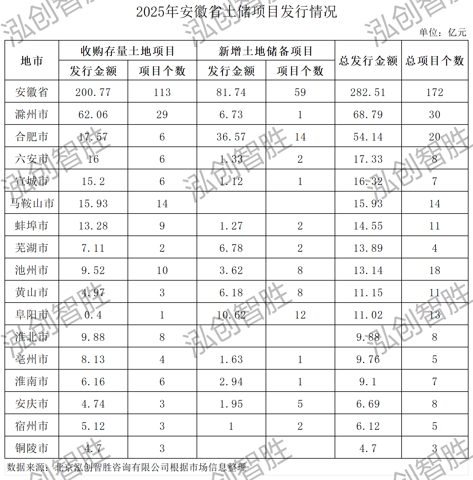 安徽省2025年共发行土地储备项目172个,发行总金额282.51亿元,其中收购存量土地项目113个,发行金额200.77亿元;新增土地储备项目59个,发行金额81.74亿元。