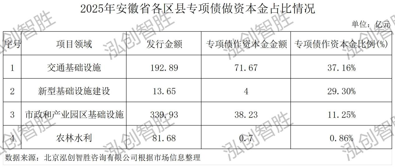 2025年安徽省1345.59亿元新增专项债券(建设类项目)中,114.6亿元用于充当项目资本金,占比8.52%。