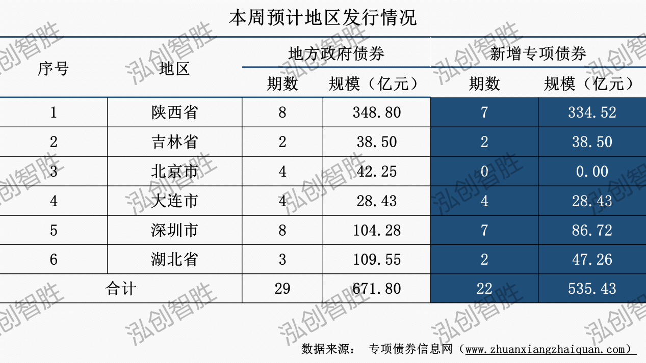 本周共有陕西省、吉林省等6个地区发行29期地方政府债券,发行规模672亿元;其中,涉及22期新增专项债券,发行规模535亿元。