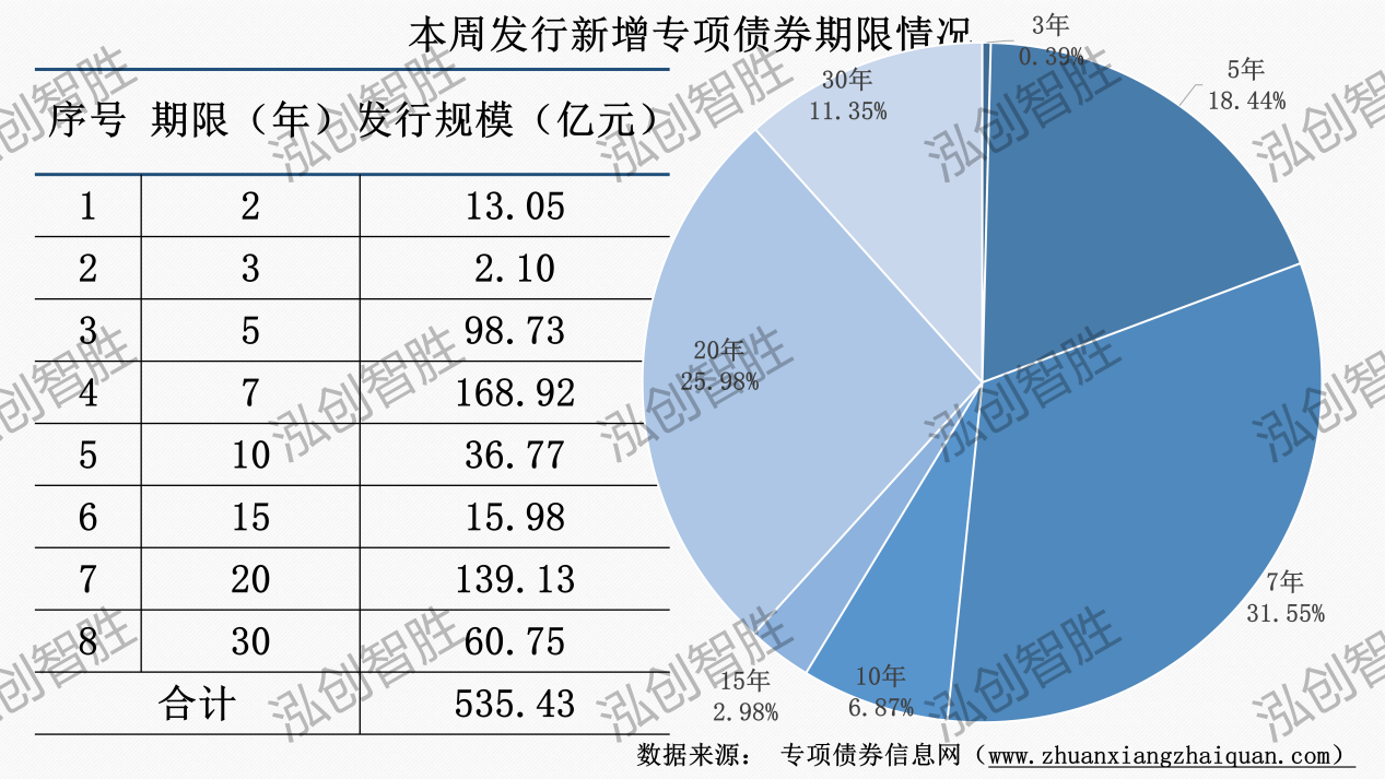 本周发行新增专项债券涉及8种期限类型,2年期、3年期、5年期、7年期、10年期、15年期、20年期、30年期。