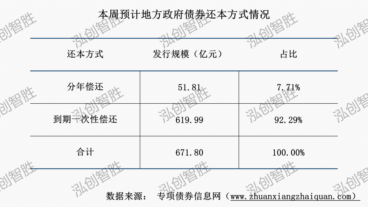 本周发行29期地方政府债券,发行规模合计671.80亿元;其中,3期新增债券采取分年还本,其余债券均采取到期一次性还本。