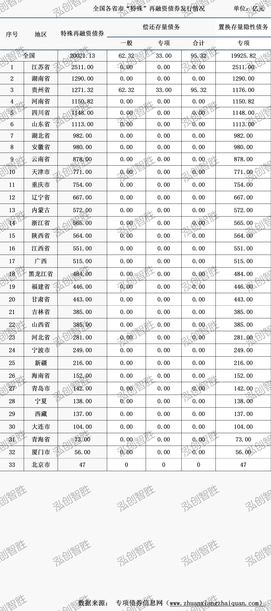 已有33个地区发行“特殊”再融资债券,发行规模20021.13亿元;均用于“置换存量隐性债务”和偿还存量债务。