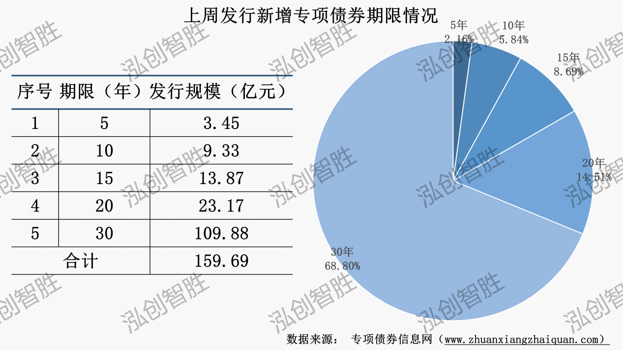 上周发行新增专项债券涉及5种期限类型,5年期、10年期、15年期、20年期、30年期。