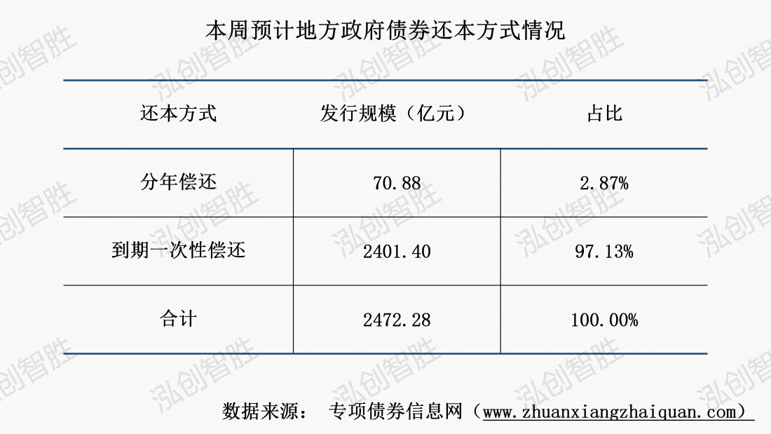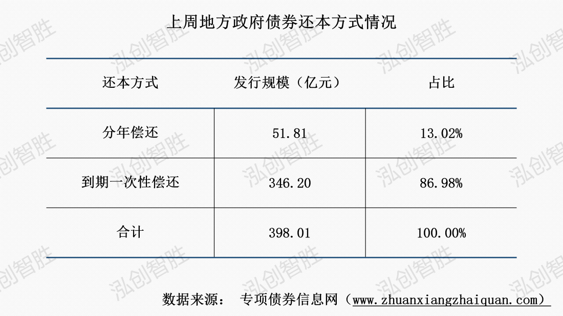 上周发行24期地方政府债券,发行规模合计398.01亿元;其中,3期新增债券采取分年还本,其余债券均采取到期一次性还本。
