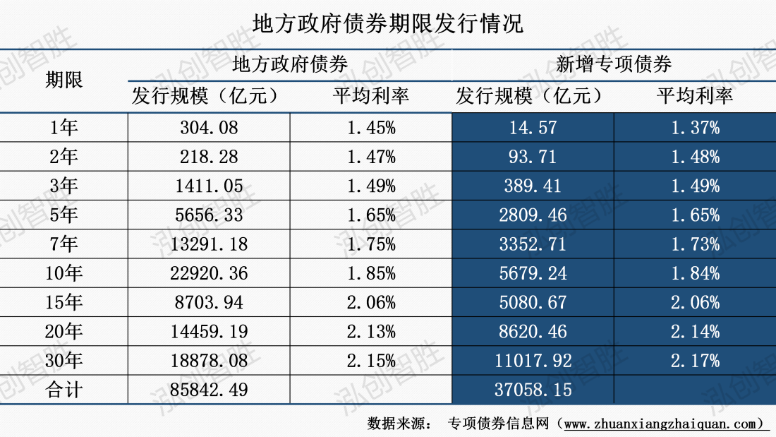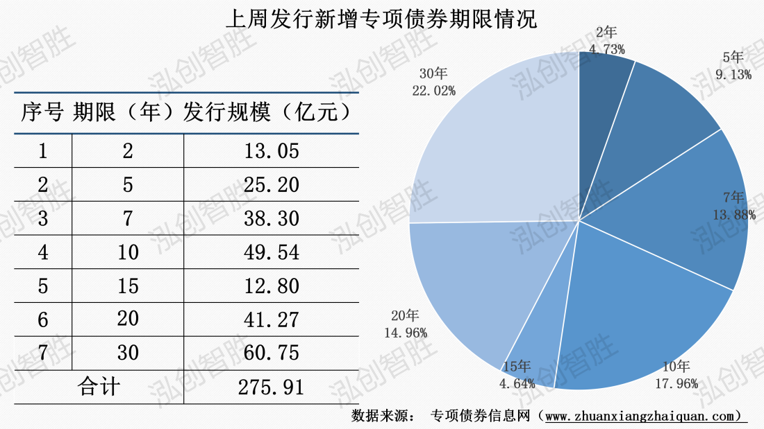 上周发行新增专项债券涉及8种期限类型,2年期、3年期、5年期、7年期、10年期、15年期、20年期、30年期。