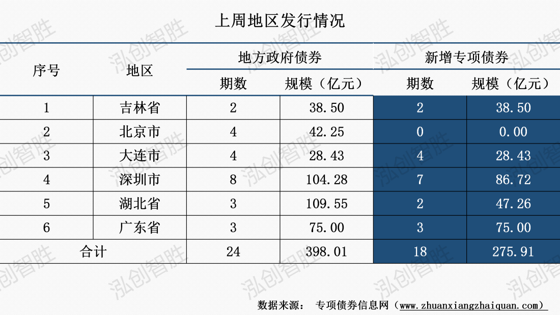 上周共有吉林省、北京市等6个地区发行24期地方政府债券,发行规模398亿元;其中,涉及18期新增专项债券,发行规模276亿元。