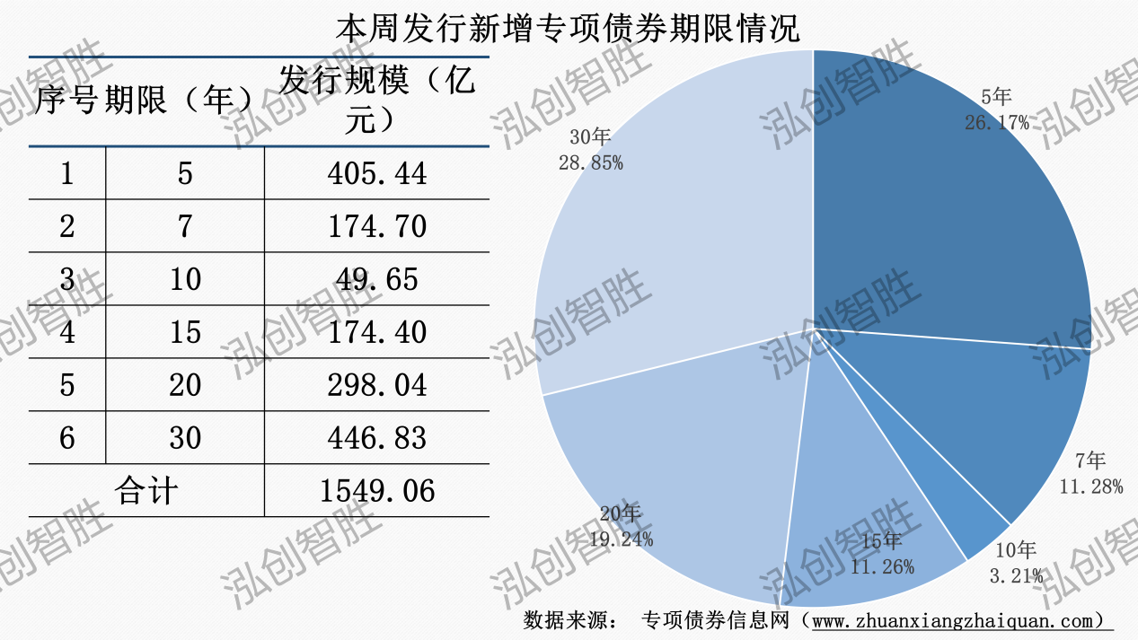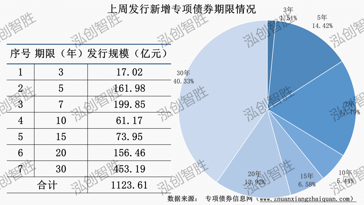 上周发行新增专项债券涉及7种期限类型,3年期、5年期、7年期、10年期、15年期、20年期、30年期。