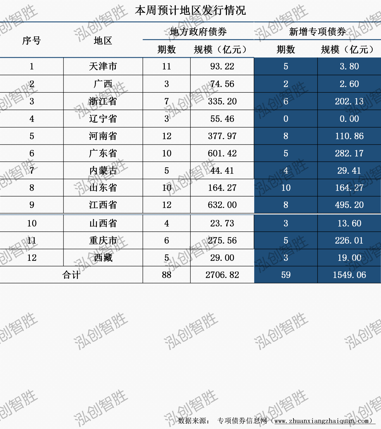 本周共有天津市、广西等12个地区发行88期地方政府债券,发行规模2707亿元;其中,涉及59期新增专项债券,发行规模1549亿元。