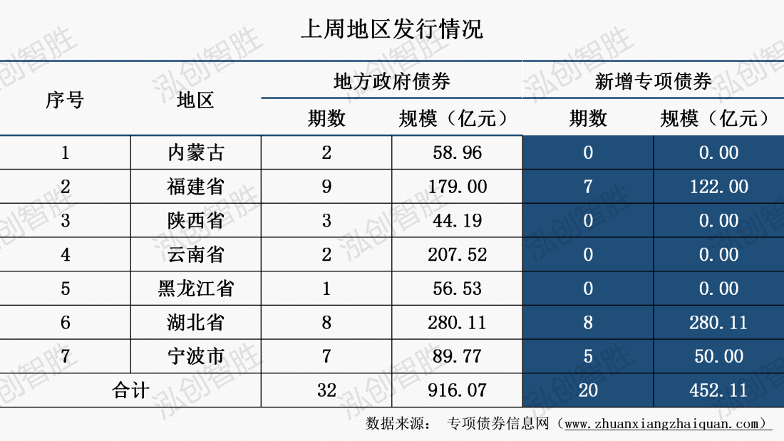 上周共有内蒙古、福建省等7个地区发行32期地方政府债券,发行规模916亿元;其中,涉及20期新增专项债券,发行规模452亿元。