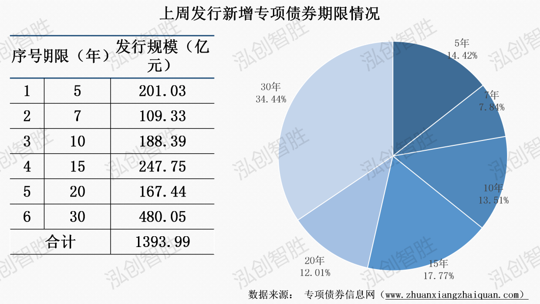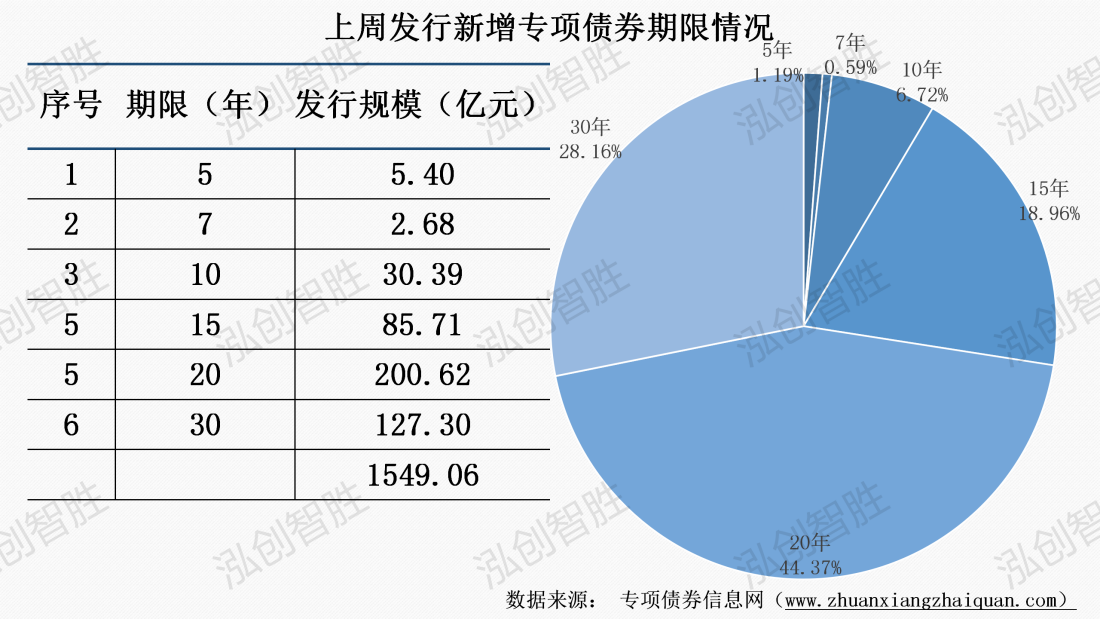 上周发行新增专项债券涉及6种期限类型,5年期、7年期、10年期、15年期、20年期、30年期。