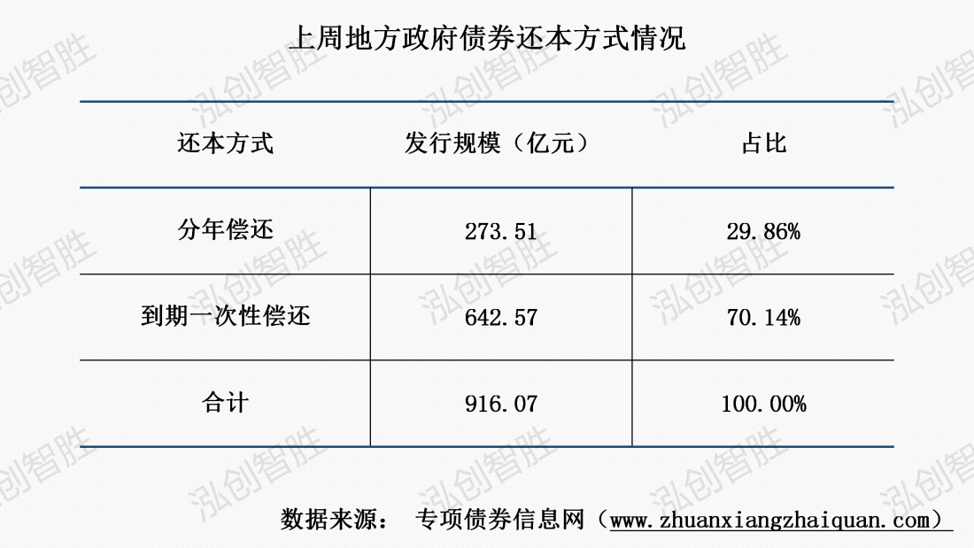上周发行32期地方政府债券,发行规模合计916.07亿元;其中,6期新增债券采取分年还本,其余债券均采取到期一次性还本。