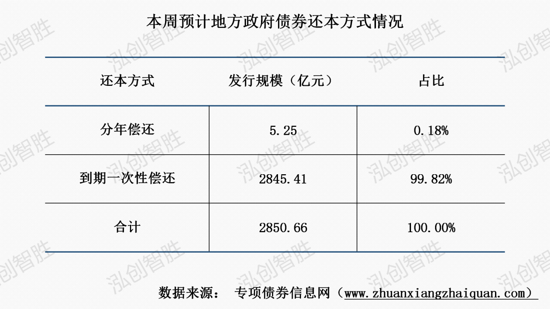 本周发行73期地方政府债券,发行规模合计2850.66亿元;其中,1期新增债券采取分年还本,其余债券均采取到期一次性还本。