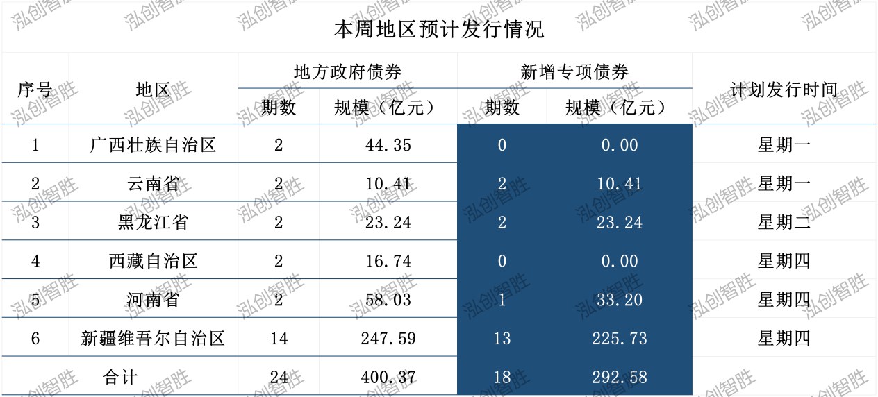 本周共有广西壮族自治区、云南省等6个地区计划发行24期地方政府债券,发行规模400.37 亿元;其中,新增专项债券计划发行18期地方政府债券,发行规模292.58 亿元。