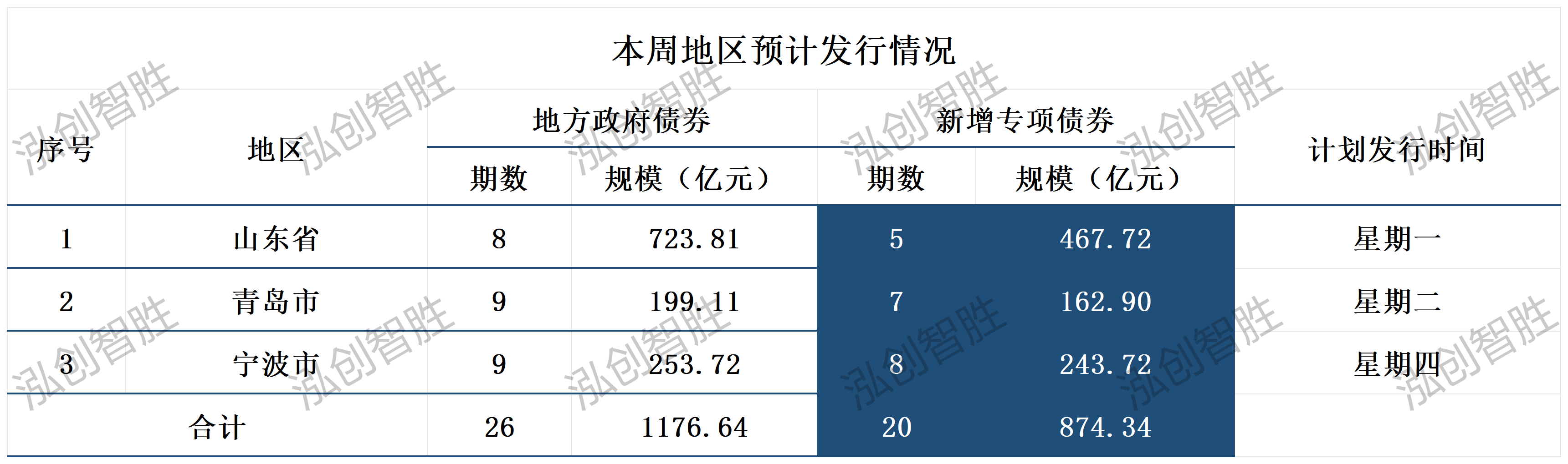 本周共有山东省、青岛市等3个地区计划发行26期地方政府债券,发行规模1176.64亿元;其中,新增专项债券计划发行20期地方政府债券,发行规模874.34亿元。
