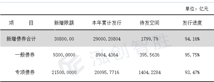 2. 截止至9月15日,发行的新增地方政府债券已完成2019年全年新增地方政府债券额度的94.16%。其中新增专项债仅剩1404.2284亿元余额空间待发,具体情况如下: