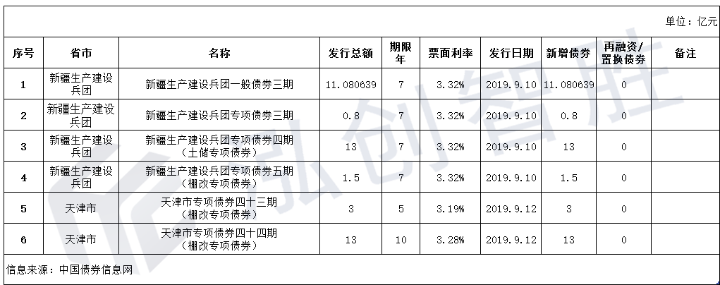9月9日-9月15日,天津市、新疆生产建设兵团共发行6只地方政府债券。共计42.380639亿元,全部为新增债券。