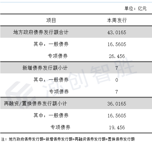 4.根据中国债券信息网信息披露,本周预计发行地方政府债券42亿元,全部为新增债券。