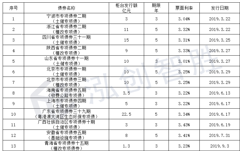 3.9月2日青海省在商业银行柜台发行了不超过1.3亿元的3年期棚改专项债券,利率3.23%,维持较低水平。为全国第十三只柜台发行的专项债券。(详情见:附表 表1-2019年柜台债发行情况)