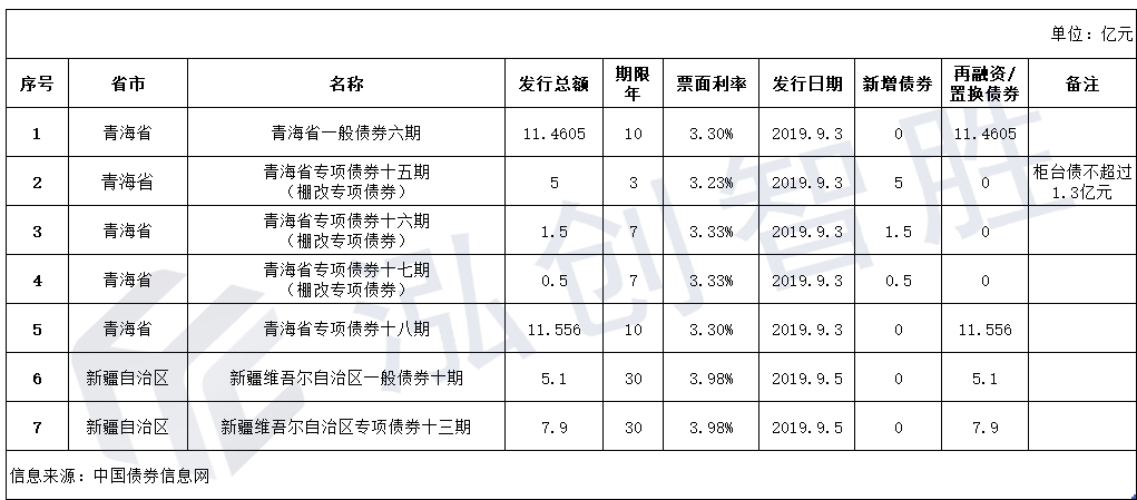1.9月2日-9月8日,青海省、新疆维吾尔自治区共发行7只地方政府债券。共计43.0165亿元,其中新增债券仅7亿元,再融资置换债券36.0165亿元。(详情见:附表 表3-2019.09.02-2019.09.08详细发行情况)