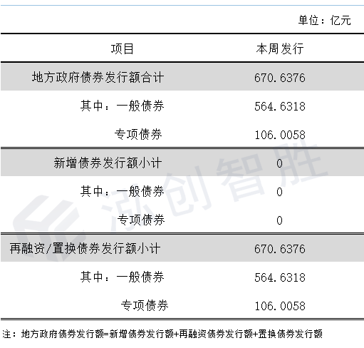 3.根据中国债券信息网披露,预计本周将发行地方政府债券670亿元,全部为再融资/置换债券。
