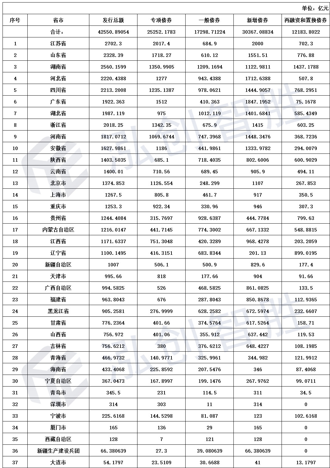 1.截止至10月27日,全国37个省市、自治区、计划单列市总计发行1067只地方政府债券,债券规模为42550.89054亿元,其中新增债券30367.08834亿元。(详情见:附表 表1-截止至2019.10.27全国各省市地方债发行情况汇总)。