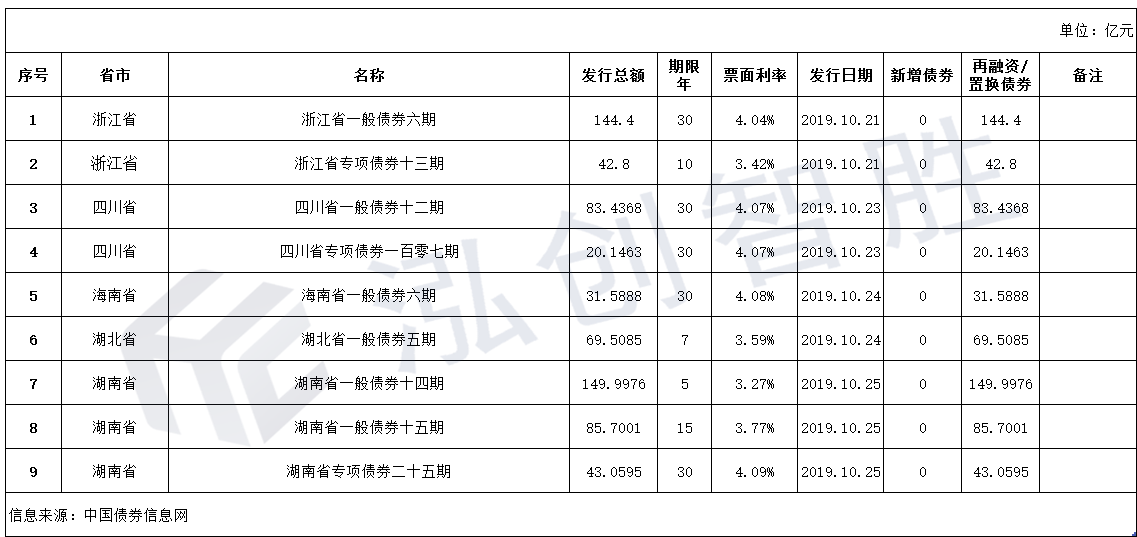 1.10月21日-10月27日,全国5个地区共发行9只地方政府债券,共计670.5376亿元,其中专项债券106.0058亿元,一般债券564.6318亿元,全部为置换/再融资债券。(详情见:附表表2-2019.10.21-2019.10.27详细发行情况)