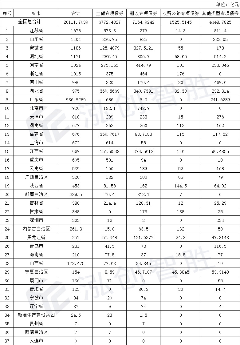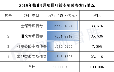 2.2019年截止至9月30日,全国37个省市、自治区、计划单列市总计发行20112亿元项目收益专项债券,其中土储专项债券6772亿元,棚改专项债券7165亿元,收费公路专项债券1526亿元,其他类型专项债券4649亿元。(详情见附表表2-2019年全国项目收益专项债发行情况汇总)
