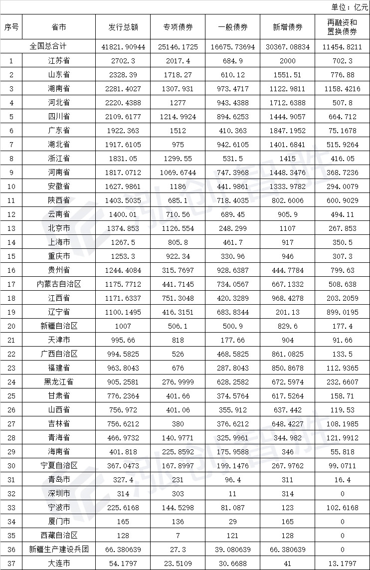 2019年截止至9月30日,全国37个省市、自治区、计划单列市总计发行1056只地方政府债券,债券规模为41822亿元,其中新增债券30367亿元,2019年下达的新增地方政府债券额度已基本完成。