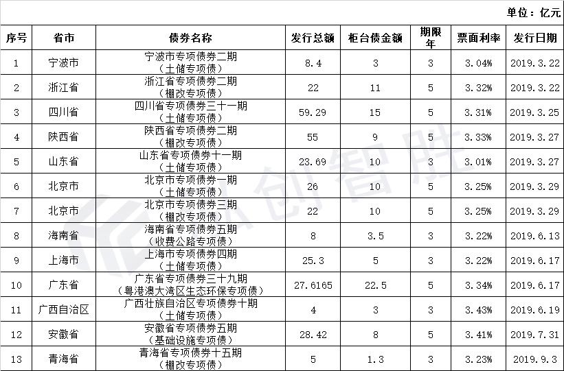 3.2019年截止至9月30日,全国共有13只地方债柜台发行,涉及12个省,共计315亿元。(详情见附表表2-2019年全国柜台债发行情况)