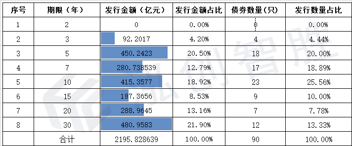 2.2019年专项债券发行主要集中于5年期、7年期、10年期(含加权期限),超长期限30年期占比大幅提升较2018年大幅提升,具体期限占比如下: