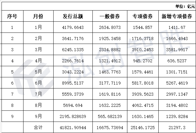4. 截止至9月30日,全国地方政府债券各月发行金额如下: