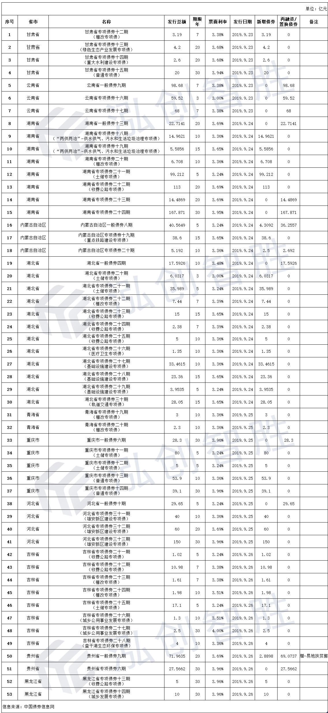 1.9月23日-9月30日,全国11个地区共发行53只地方政府债券。共计1610.9646亿元,其中新增债券968.5624亿元,置换/再融资债券642.4022亿元。(详情见:附表 表2-2019.09.23-2019.09.30详细发行情况)
