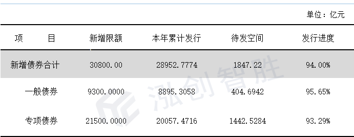 2. 截止至9月1日,发行的新增地方政府债券已完成全年新增地方政府债券额度的94%。其中新增专项债仅剩1442.5284亿元余额待发,具体情况如下: