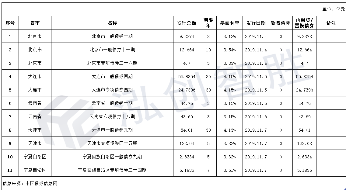 1.11月04日-11月10日,全国5个地区共发行11只地方政府债券,共计379.4832亿元,其中专项债券200.3431亿元,一般债券179.1401亿元,全部为置换/再融资债券。(详情见:附表表2-2019.11.04-2019.11.10详细发行情况)