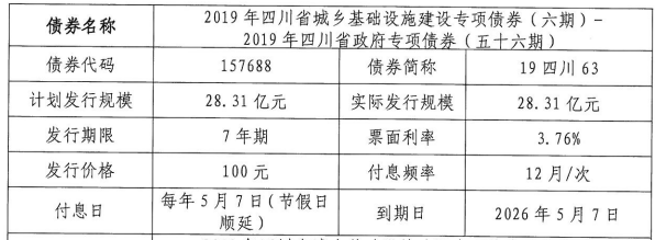 在财政部下达的政府债务限额内,2019 年四川省城乡基础设施建设专项债券(六期)—2019 年四川省政府专项债券(五十六)期通过招标方式发行,发行总额为发行总额为0.7亿元,品种为记账式固定利率附息债券,全部为新增债券,期限为7年,利率3.76%。