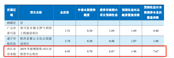 根据会计师事务所出具财务评估报告,认为经专项审核,在对项目收益预测及其所依据的各项假设前提下,本次评价的“内江市体育中心建设项目”预期的项目收益能够合理保障偿还融资本金和利息,实现项目收益与融资自求平衡。