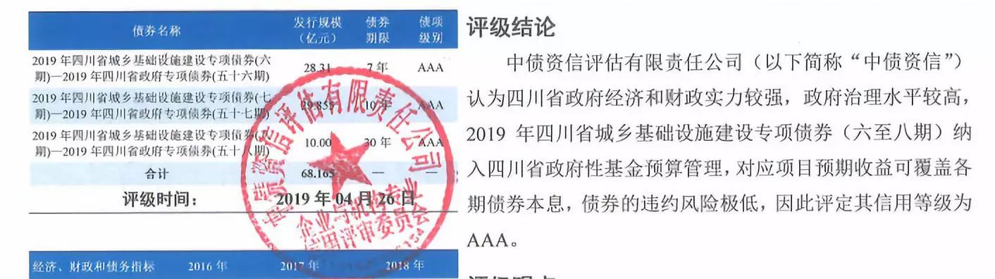 经中债资信评估有限责任公司综合评定,2019 年四川省城乡基础设施建设专项债券(六期)—2019 年四川省政府专项债券(五十六期)信用评级为AAA。